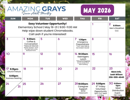 Amazing Grays is a place for senior adults to connect, build friendships, and continue growing in their faith—because God’s not finished with you yet. It’s a community where you can stay encouraged, involved, and walking with purpose in every season of life.